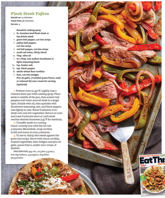 1. Preheat oven to 450°F. Lightly coat a rimmed sheet pan with cooking spray. Place steak in middle of the pan, then scatter bell peppers and onion around steak in a single layer. Drizzle with oil, then sprinkle with Southwest seasoning, salt, and black pepper; toss lightly to coat. Roast 8 minutes; turn steak over and stir vegetables. Return to oven and roast 8 minutes more or until steak reaches desired doneness (1 45 °F for medium).